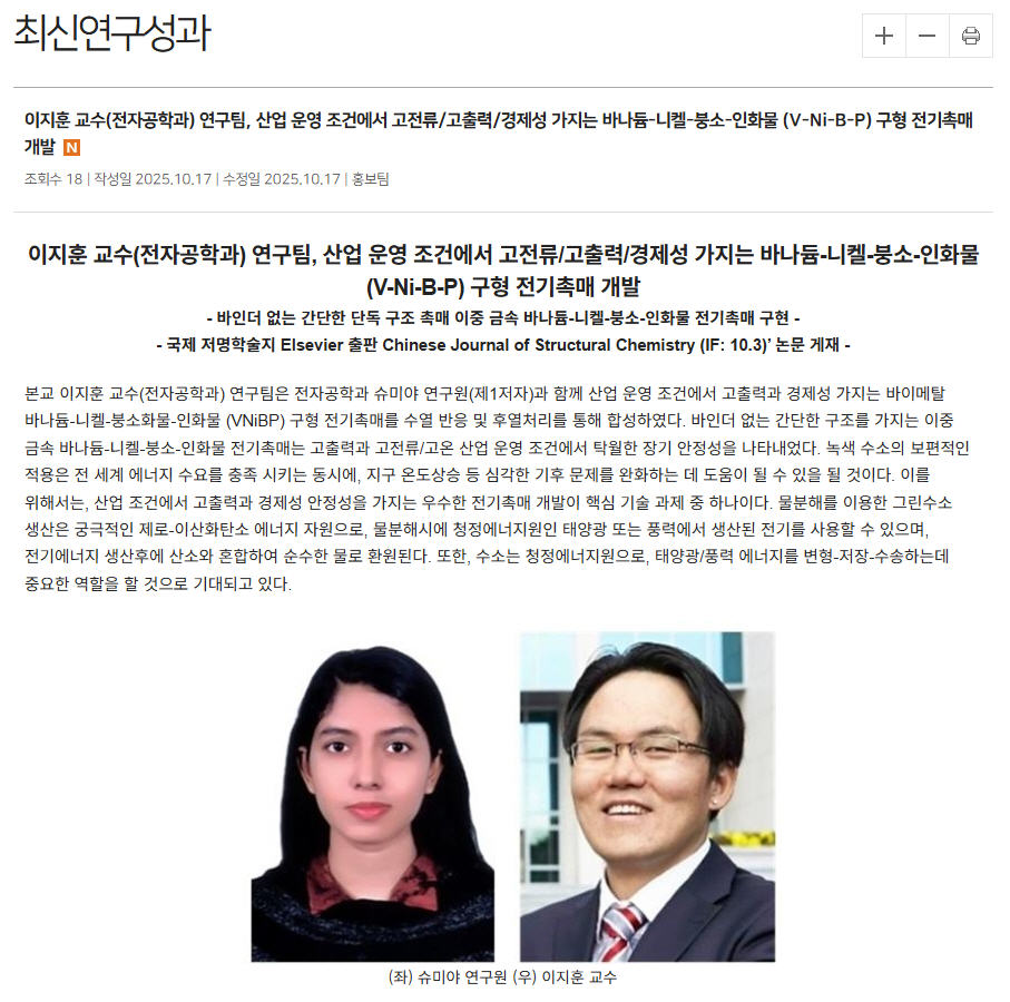 Title: 이지훈 교수(전자공학과) 연구팀, 산업 운영 조건에서 고전류/고출력/경제성 가지는 바나듐-니켈-붕소-인화물 (V-Ni-B-P) 구형 전기촉매 개발