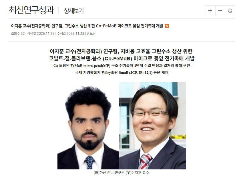 Title: 이지훈 교수(전자공학과) 연구팀, 그린수소 생산 위한 Co-FeMoB 마이크로 꽃잎 전기촉매 개발