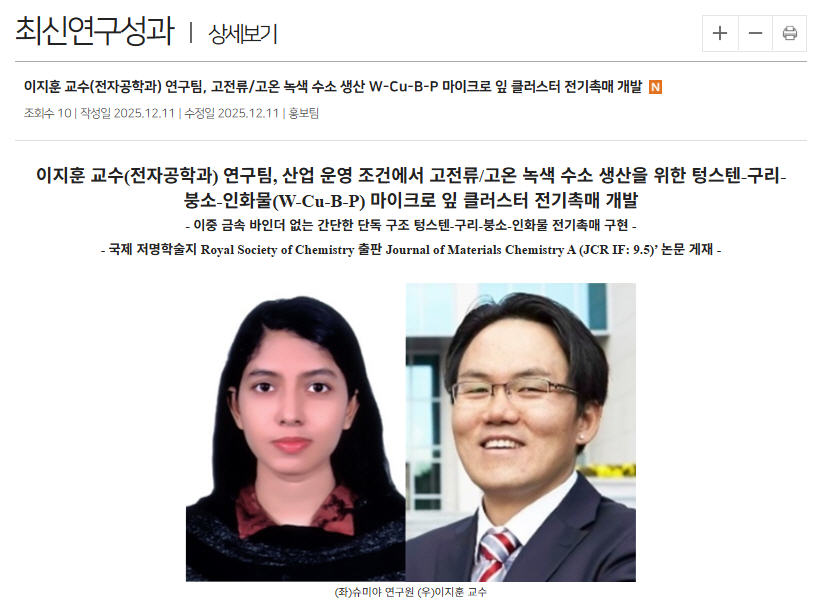 Title: 이지훈 교수(전자공학과) 연구팀, 산업 운영 조건에서 고전류/고온 녹색 수소 생산을 위한 텅스텐-구리-붕소-인화물(W-Cu-B-P) 마이크로 잎 클러스터 전기촉매 개발
